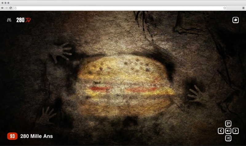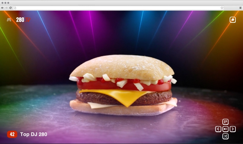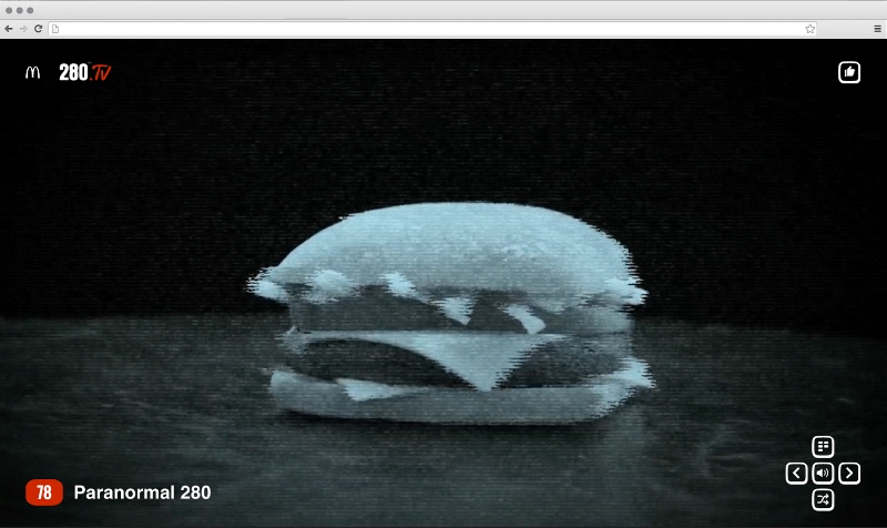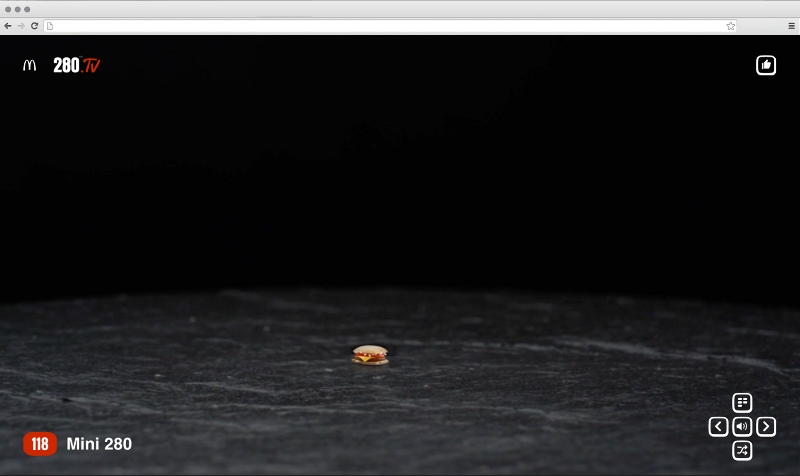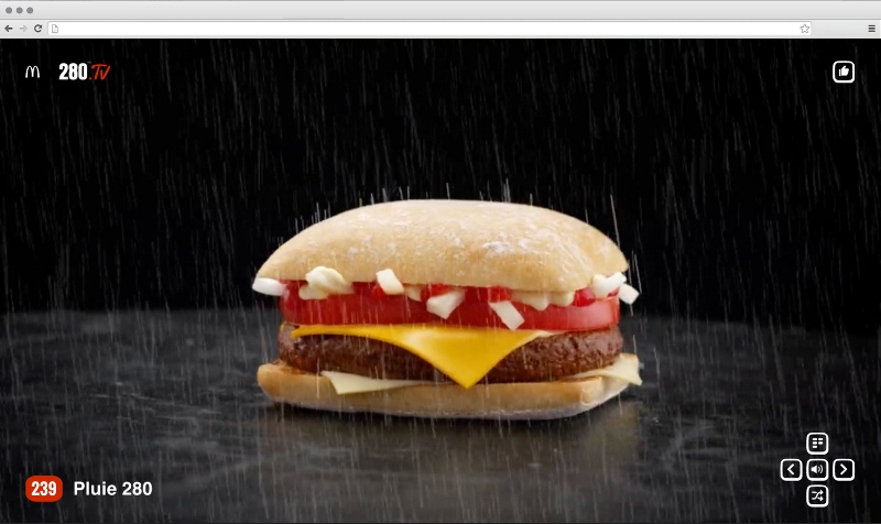 McDonald's и DDB Paris представили кампанию, целиком посвященную бургеру 280 (именно столько граммов он весит), точнее его возвращению в меню закусочных во Франции. По этому случаю был запушен сайт 280.TV, где можно без остановки переключаться между 280 тематическими каналами, будь то спортивный, философский, модный, кулинарный и т.д. Главным героем всех трансляций является бургер 280, например мокнущий под дождем или крутящийся в лучах цветомузыки на танцполе.