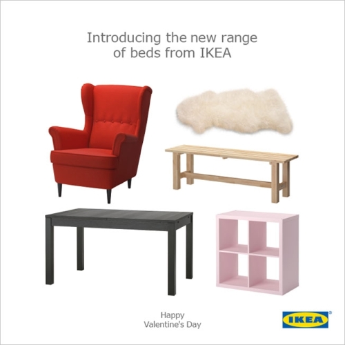 3. IKEA как всегда с юмором прорекламировала собственные товары, представив в Сингапуре новую линейку «кроватей» ко Дню Св. Валентина 2016. Только они не очень подходят для сна. Два года назад маркетологи шведской компании запустили акцию для тех, у кого родится ребенок через девять месяцев после 14 февраля, обещая подарить им колыбельку.