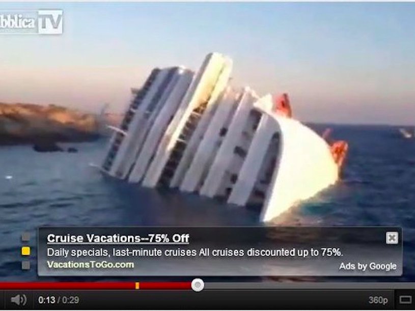 1. В 2012 году это объявление предлагало скидки на круизы над видео о тонущем Costa Concordia.