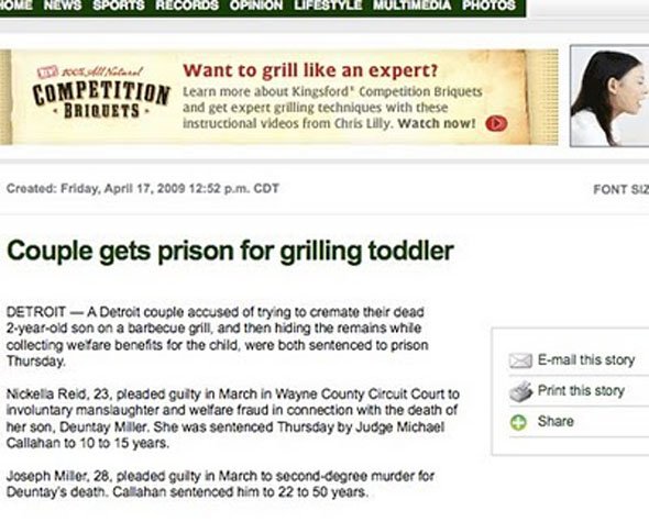 7. Сообщение о паре, получившей тюремный срок за попытку кремировать своего умершего малыша (поджарив его), вероятно, не самое лучшее обрамление для рекламы экспертов по приготовлению гриля.