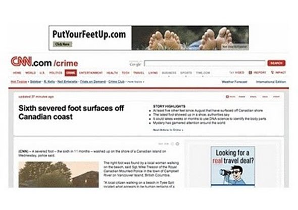 16. Эта реклама средства для ног PutYourFeetup.com тоже появилась в неудачное время - как раз когда на странице появилась заметка о найденных шести отрезанных фрагментах ног на канадском побережье.