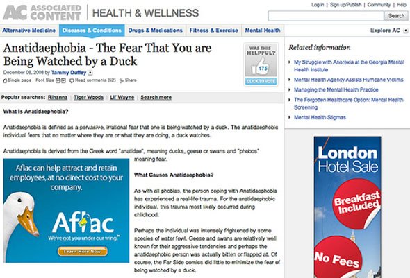 10. Объявление для Aflac с изображением утки выглядит как преднамеренное издевательство над содержимом расположенного рядом текста. В заметке говорится о редком виде фобии - страхе, что за вами наблюдает утка