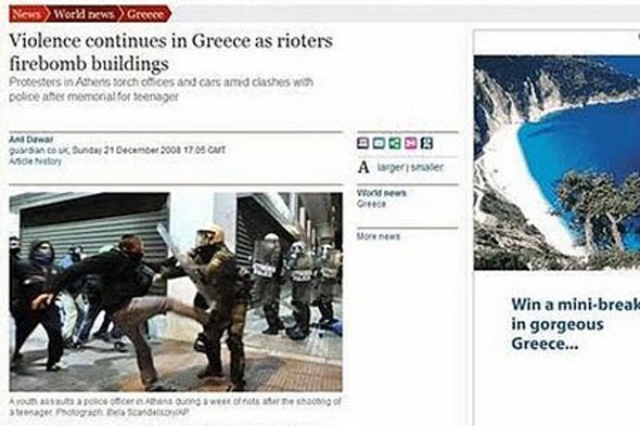 19. Реклама отдыха в Греции неубедительно выглядит рядом с историей в Guardian о насилии и беспорядках в этом регионе.