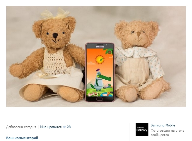 Samsung в своем сообществе во «ВКонтакте» в честь праздника выкладывает милые картинки товаров в окружении мягких игрушек.