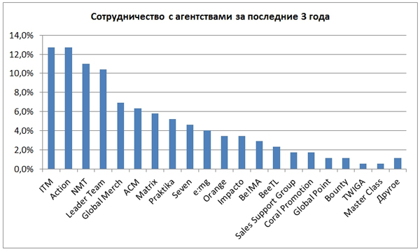 3. С большинством из агентств респонденты работали за последние 3 года . Наиболее активная работа ведется с компаниями ITM, Action, NMT, Leader Team, Global Merch.
