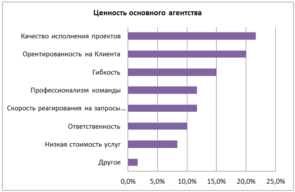 5-7. БОльшую часть респондентов (75%) устраивает их основное агентство. Свое основное агентство они ценят за качество исполнения проектов, клиент ориентированность, гибкость и профессионализм. Стоит отметить, что Качество вопреки Цене и Известности агентства является более важным фактором при выборе подрядчика.