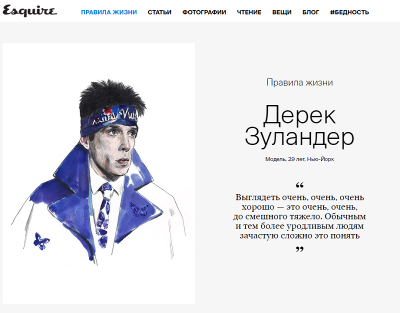 На сайте издания появились правила жизни 29-летнего модели-мужчины из Нью-Йорка – Дерека Зуландера. В них он рассуждает о трудностях модельной карьеры, вкусных шампунях, таланте Мэттью МакКонахи, #хэштегах и утверждает, что о нем сняли документальный фильм.