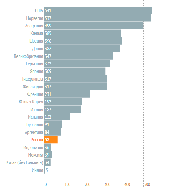 Ее же свежий отчет напоминает нам, что Россия по-прежнему довольно скромный рынок, по мировым меркам. Эксперты взяли расходы на всю рекламу в стране (наружную, телевизионную, в бумажных медиа, на радио и в интернете) и разделили на число жителей. Российский подушевой «валовый рекламный продукт», по данным 2013 года, составляет $68 – в 8 раз меньше, чем в США (лидер списка), но в 14 раз больше, чем в бедной и густонаселенной Индии.