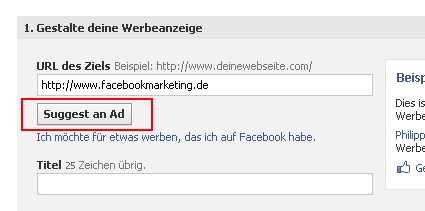 Как сообщает немецкий блоггер Jens Wiese, в рамках ограниченного тестирования Facebook добавила рекламодателям опцию "Suggest an Ad", предлагающую автоматическое создание объявления, основанного на контенте сайта. Помимо текста рекламы, инструмент предлагает и изображение для баннера, создаваемое из скриншота главной страницы рекламируемого ресурса.