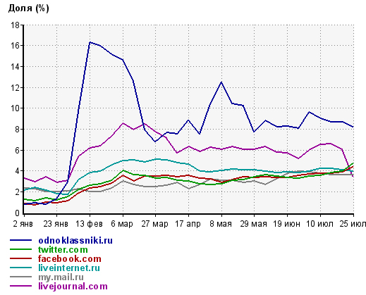На падении ЖЖ больше всего поднялись Twitter и Facebook