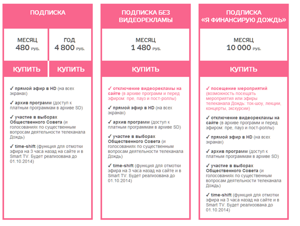Подписка на «Дождь» теперь будет стоить 480 рублей в месяц или 4800 рублей в год. При этом включенные опции существенно расширяются. Пользователи получат эфир в HD на всех устройствах, доступ к платным архивам, участие в выборах Общественного совета и time-shift, функцию для отмотки эфира на 3 часа назад на сайте и в Smart TV (будет реализована до 1 октября 2014 года). Также появятся 2 вида более дорогих подписок на месяц — для отключения видеорекламы на сайте (1480 рублей в месяц) и посещения мероприятий «Дождя» (10 000 рублей).