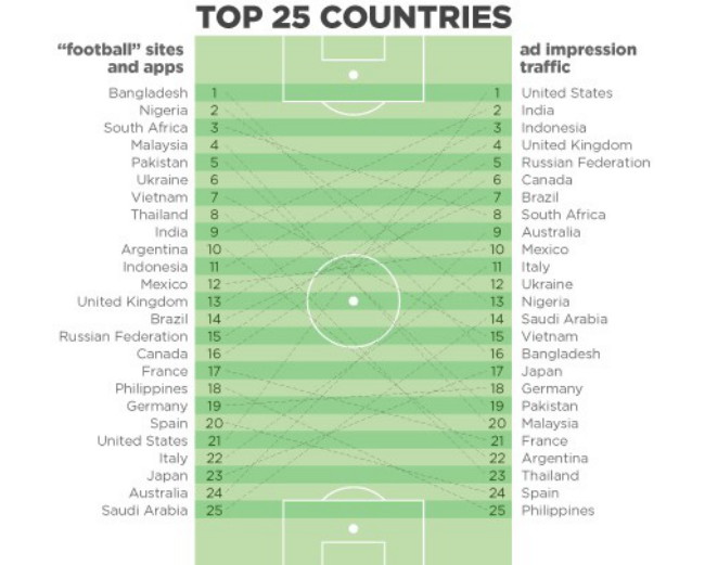 В ходе исследования выяснилось, что Азия и Африка потребляют больше футбольного контента на своих мобильных устройствах, чем США, Европа и даже Латинская Америка. По общему объему трафика лидирующие позиции занимают США, Индия, Индонезия и Великобритания. На пятом месте находится Россия. Однако картина меняется, если говорить об объеме трафика с футбольным контентом. Топ-25 стран по объему трафика к веб-сайтам и приложениям, посвященным футболу, возглавляют такие страны, как Бангладеш, Нигерия, Южная Африка, Малайзия и Пакистан. Россия в этом списке оказалась уже на 15 позиции.