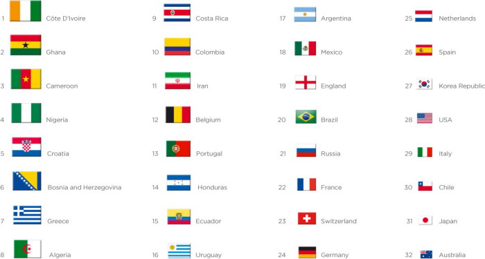 Из всех стран, участвующих в футбольном первенстве, максимальный интерес к событию проявляют пользователи, проживающие в странах Западной Африки и Восточной Европы, в частности, в Кот-д’Ивуаре, Гане, Камеруне, Нигерии, Хорватии, Боснии и Герцеговине, Греции. Россия в этом рейтинге занимает 21 место, а жители Японии и Австралии проявляют минимальный интерес к чемпионату мира.