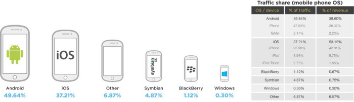 Любопытно, что взрывной рост мобильного трафика в Бразилии пришелся на платформу Android. С момента начала футбольного первенства 79% всего дополнительного трафика в этой стране было сгенерировано пользователями Android-устройств. Во втором квартале 2014 года Android не только занял первое место по объему трафика мобильной рекламы, увеличив его с 42,8% в первом квартале до почти 50% во втором, но также продемонстрировал серьезный рост в объеме доходов от мобильной рекламы. Согласно исследованию, 38% всех доходов от мобильной рекламы теперь приходится именно на платформу Android, тогда как кварталом ранее данный показатель составлял всего 33%.