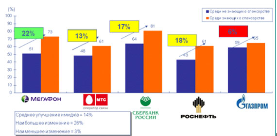 Так, например, в нефтяной категории Газпром лучше всех ассоциируется с олимпийским спонсорством, хотя спонсирует другие спортивные мероприятия. Роснефть, напротив, являясь Олимпийским спонсором, слабо заявляет о нем и получает результаты, близкие к Газпрому.