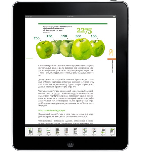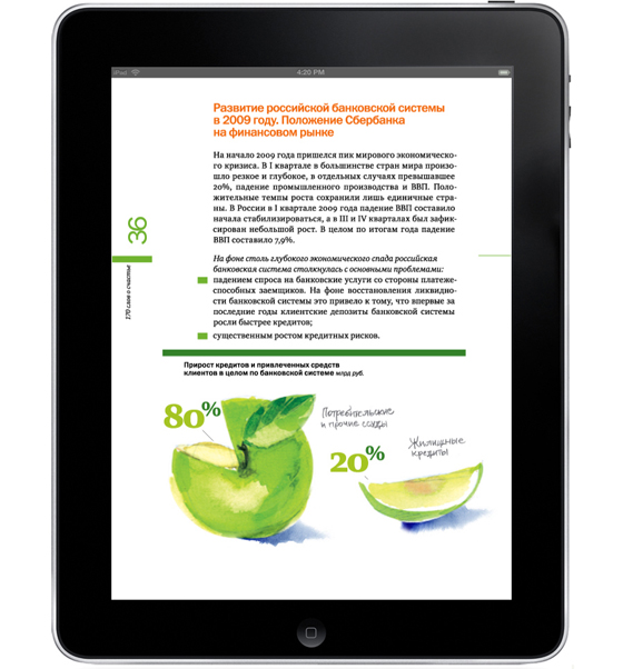 С появлением инновационных продуктов, таких как iPad, возникла необходимость в создании браузерных приложений или адаптации существующих полиграфических и презентационных материалов для планшетов. Таким образом «Сбербанк РФ» представил версию годового отчета в формате IPad и еще раз доказал, что является лидером в освоении самых современных технологий ведения бизнеса. Бесплатное приложение уже сейчас доступно для скачивания на Itunes App store.