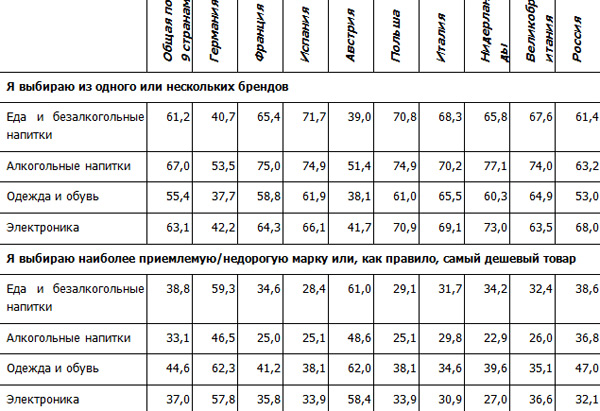 Однако, потребители других европейских стран, принявшие участие в исследовании, оказались более ориентированы на марку товара. Например, бренд является решающим фактором для 70% жителей Испании и Польши когда они покупают еду и безалкогольные напитки. 65% итальянцев и англичан смотрят на бренд, выбирая одежду и обувь. Около 70% покупателей в Нидерландах и Польше ориентируются на бренд при покупке электроники, в России их доля составляет 68%. 61% россиян решают в пользу бренда при покупке продуктов питания и безалкогольных напитков.