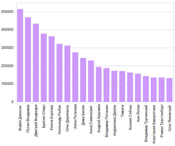Первое место по числу запросов за год занял Майкл Джексон (514 тыс. обращений), второй Владимир Путин с 469 тыс. обращений