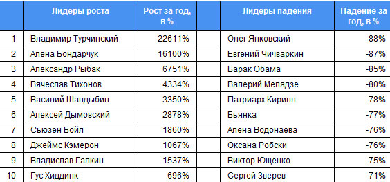 Наибольший прирост запросов в процентах в 2009 году получили Алексей Дымовский (+25,8 тыс.%), Александр Рыбак (+31,9 тыс.%) и Владимир Турчинский (+56,9 тыс.%)