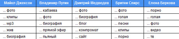 Рассматривая уточняющие вопросы пользователей по пяти персонам, лидирующим по обращениям рунетчиков, убеждаемся, что скандальные запросы живо интересуют сетевую общественность. И если касательно порноактрисы Елены Берковой это интерес к ее прямой деятельности, то у певицы Бритни Спирс песни и клипы уступают запросам фото, в том числе в голом виде. Впрочем, за год эти запросы практически не изменились.