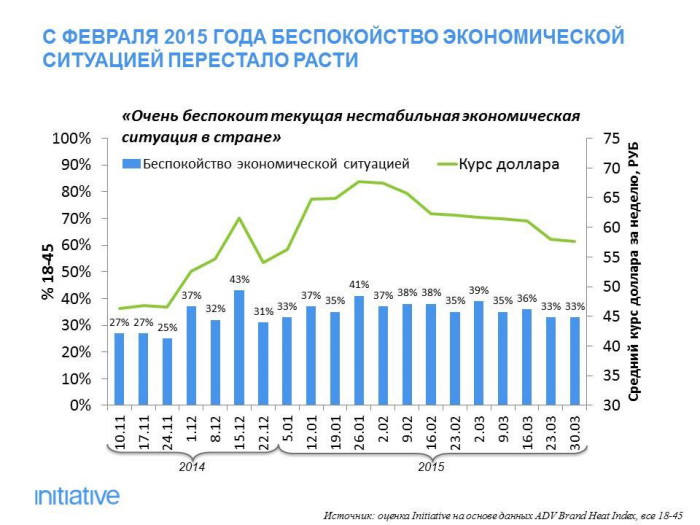 С февраля 2015 года обеспокоенность россиян экономической ситуацией в стране перестала расти, намечаются первые признаки стабилизации. Если в декабре 2014 года беспокойство граждан достигло пика – 43% респондентов в возрасте 18-45 лет ответили положительно на утверждение: «Очень беспокоит текущая нестабильная экономическая ситуация в стране», то с февраля 2015 года уровень беспокойства падает, и уже в марте количество таких респондентов снизилось до 33%. Происходит это на фоне снижающегося курса доллара.