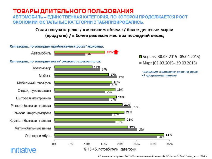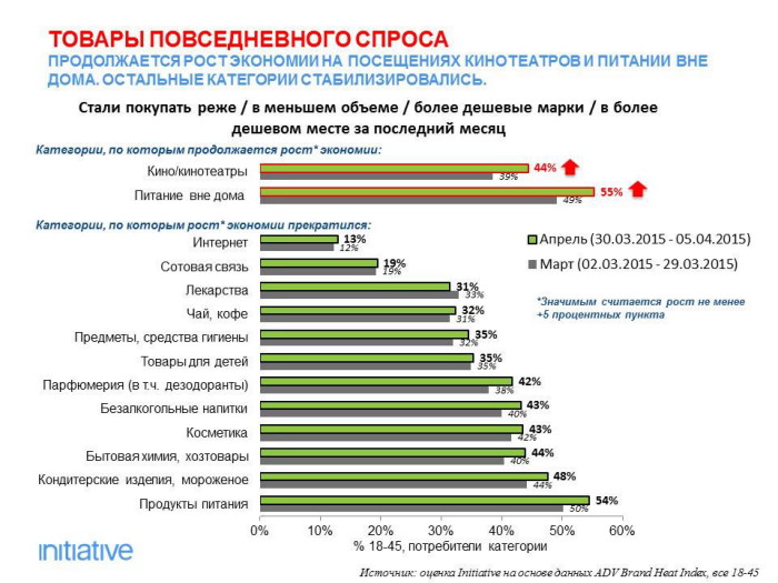 С конца марта 2015 года стабилизировалась ситуация и по категориям товаров. Но все еще растет число россиян, продолжающих экономить на автомобилях, походах в кинотеатры и питании вне дома. Незначительно увеличилось число потребителей, экономящих на ремонте квартиры (4%), путешествиях и отдыхе (4%), на покупке крупной бытовой техники (2%), одежды и обуви (2%) и на мобильной связи (1%).