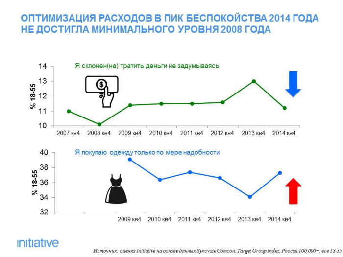 «Если сравнивать потребительское поведение россиян в кризис 2008 года и в сегодняшней экономической ситуации, то сейчас кризисные тенденции проявлялись в меньшей степени. Конечно, в данный период россияне пересматривают свое отношение к покупкам и начинают экономить, однако даже в пик беспокойства, который произошел в 2014 году, уровень оптимизации расходов не достиг минимального уровня 2008 года. Это может говорить о том, что россияне стали более уверенными в своем финансовом положении, чем в прошлый кризисный период», – отмечает Анна Яковлева, генеральный директор агентства Initiative.