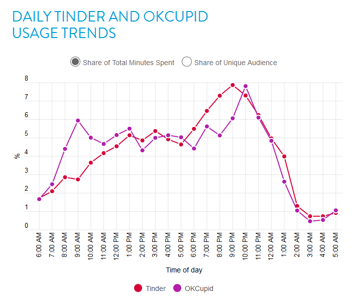 Исследование показало, что приложения для знакомств пользуются наибольшей популярностью не в ночное время, как можно было бы предположить, а в прайм-тайм. К примеру, сервис для знакомств OkCupid (ОКС) наиболее популярен среди утренних посетителей, которые проверяют «совпадения» и сообщения, когда просыпаются, а также перед сном. 6 часов вечера является временем, когда пользователи другого приложения для онлайн-знакомств Tinder достигают большей активности, нежели пользователи ОКС. 10-11 вечера — наиболее популярное время для пользователей обоих приложений.