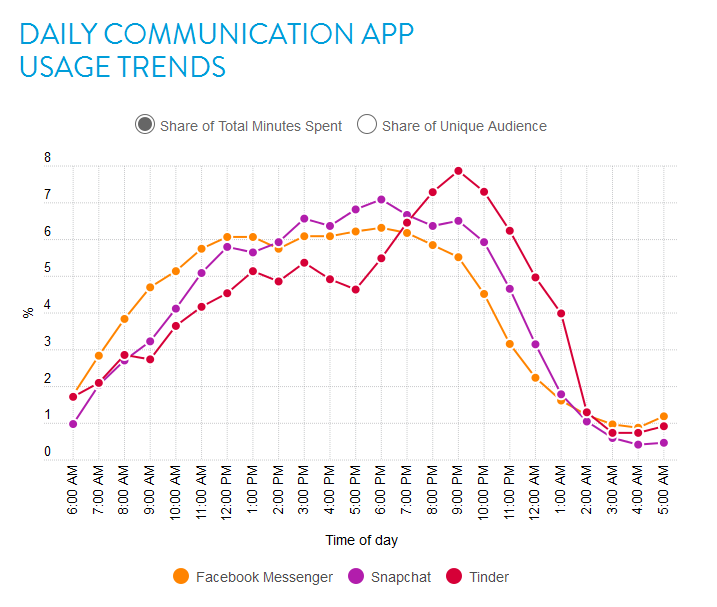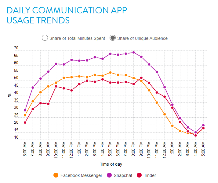 Что же с другими коммуникационными сервисами? Исследование показало, что американские пользователи переключаются с одного приложения на другое в течение дня. Среди трех приложений — Facebook Messenger, Snapchat и Tinder — активнее всего с утра до двух часов дня используется Facebook Messenger, после чего пользователь переключается на Snapchat, а к восьми вечера в «игру» вступает Tinder.