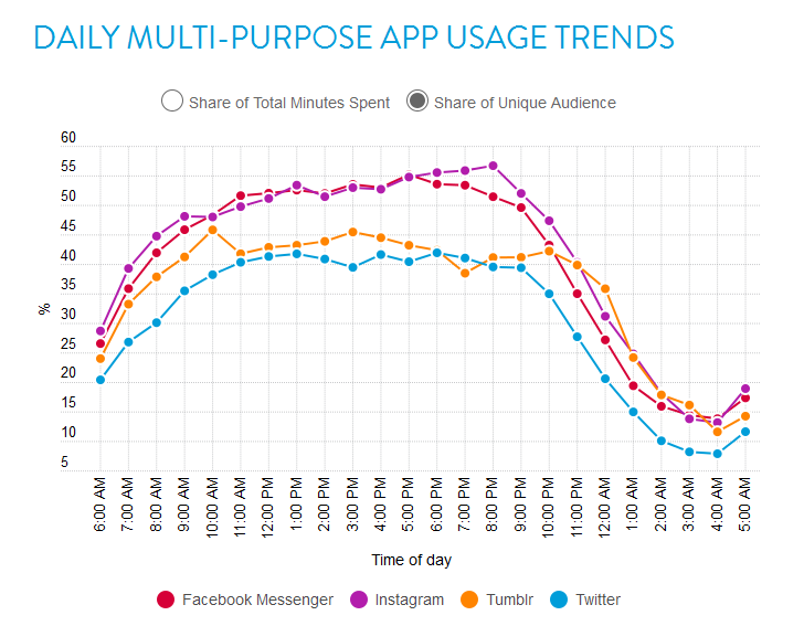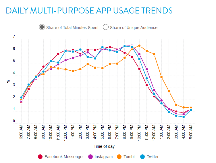 Существуют программы, стирающие границы между социальной коммуникацией и обменом сообщениями. В их числе Tumblr, Twitter, Instagram и Facebook Messenger. Раньше всех пользователей теряет Facebook Messenger, намного позже вечером — Twitter и Instagram, а доля проведенного времени на Tumblr не падает допоздна. Продукты Facebook привлекают большую часть своих активных пользователей в середине дня.
