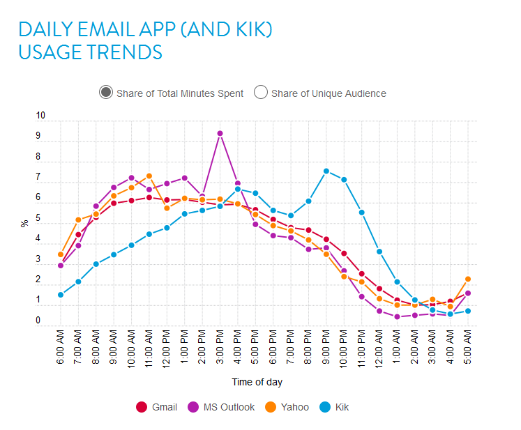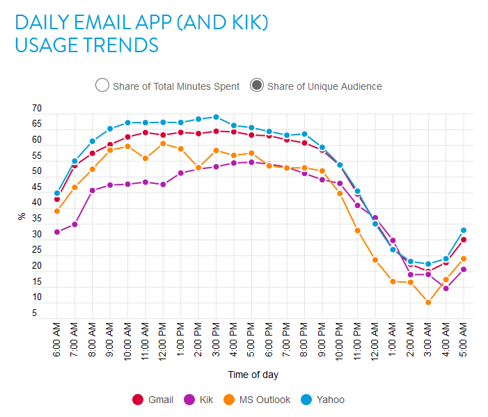 У e-mail приложений довольно схожий тренд использования в течение дня, за исключением всплеска активности у Microsoft Outlook в дневное время. Частое использование почтовых приложений показывает, насколько эта технология прочно внедрилась в жизнь мобильных пользователей. Доля уникальной аудитории e-mail сервисов составляет больше 20% во все ночные часы, и может вырасти до 65% — это означает, что более половины пользователей проверяют почту как минимум раз каждый час.