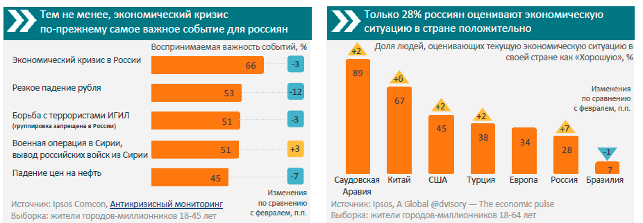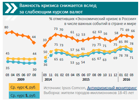 После значительного снижения курса доллара и евро в марте, уменьшилось и количество людей, которые отметили экономический кризис в России как важное событие, говорится в исследовании Ipsos Comcon по итогам замеров в марте 2016. В восприятии россиян экономическая ситуация стабилизируется. Это происходит на фоне отсутствия каких-либо социальных и политических потрясений и привыкания к текущим условиям.