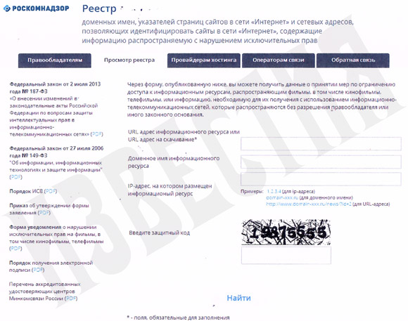 Как видно, подающему заявление на блокировку представителю правообладателя надо будет указать не только свои фамилию, имя и отчество, но обязательно еще и паспортные данные. Напомним, на сайте zapret-info.gov.ru, где уже сейчас любой пользователь Сети может пожаловаться на противозаконную информацию (детскую порнографию, пропаганду суицида, распространение наркотических веществ) паспортные данные вводить не надо — для этого даже нет строчки в форме.