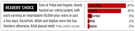 (R/GA не смог пробиться выше 9-го места, потому что фанаты Tribal и Organic буквально «хакнули» систему голосования AdweekMedia)