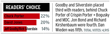 Джефф Гудби и Рич Сильверстайн, сопредседатели и креативные директора Goodby, Silverstein & Partners, установили новые творческие стандарты с тех пор как открыли свое агентство в Сан-Франциско в 1983 году. За прошедшие 10 лет пара, которая попала в Hall of Fame The One Club в 2004, управляла своим агентством, стабилизируя его рост, находя и принимая на ведущие лидерские должности талантливых людей, и таким образом успешно провела его по ухабистой дороге в цифровую эру. В то время как Гудби, 58, и 60-летний Сильверстайн признают, что они абсолютно разные и в проявлениях индивидуальности, и в стиле управления, их общей страстью всегда была работа. «Нас называют недееспособным папой и сумасшедшим дядей», - сказал Джефф Гудби в интервью Adweek в 2005. Недееспособное или сумасшедшее, но это партнерство продолжает служить вдохновением для креатива и образцом агентского лидерства.
