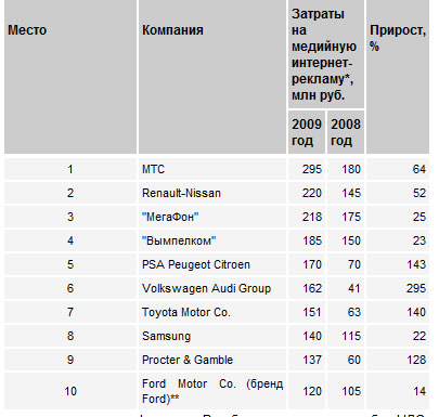 Десять крупнейших рекламодателей рунета в 2009 году потратили 1,8 млрд руб., или на 24,1% больше, чем годом ранее. Особенно не скупились автопроизводители (бюджеты тех, кто попал в топ-10, выросли на 14-295%) и сотовые компании (на 23-64%). Во всех других сегментах — в наружной рекламе, прессе, на радио и телевидении — затраты только сокращались.