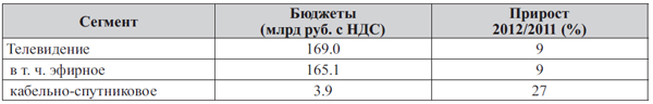 По оценке АКАР, за 2012 год общий объем бюджетов в телерекламном сегменте составил 169 млрд руб. (с учетом НДС), что почти на 9 % превысило показатели прошлого года. Основная часть этих денег (165,1 млрд) пришлась на эфирное ТВ. Объемы рекламных бюджетов на неэфирном ТВ заметно скромнее (3,9 млрд), зато этот субсегмент характеризует поистине выдающаяся динамика прироста - 27 % (табл. 1).