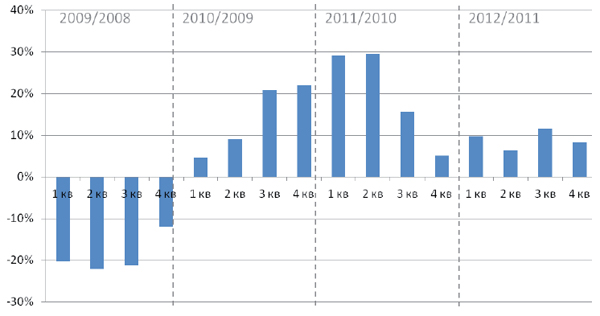 Рисунок 1. Темпы прироста (к предыдущему году) рекламных бюджетов на