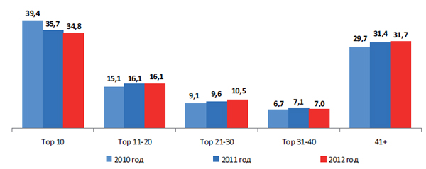 Позитивной можно назвать тенденцию снижения суммарной доли бюджетов, приходящуюся на Топ-10 крупнейших рекламодателей. Она сократилась с 39,4 % в 2010 году до 34,8 % в 2012 году (рис. 2). При этом активизировались средние и небольшие (по телевизионным меркам) рекламодатели. В долгосрочной перспективе сокращение относительной доли крупнейших рекламодателей при абсолютном росте рекламного рынка свидетельствует о его диверсификации, что является, несомненно, позитивным трендом. Однако конкретно в 2012 году десятку крупнейших рекламодателей на ТВ представляли транснациональные FMCG-гиганты, и динамика по ним оказалась ниже среднерыночной. Этот тревожный знак, безусловно, отражает общую кризисную ситуацию в мире. Если учесть, что FMCG традиционно является своего рода гарантом стабильности телерекламного сегмента, то данная тенденция приобретает для