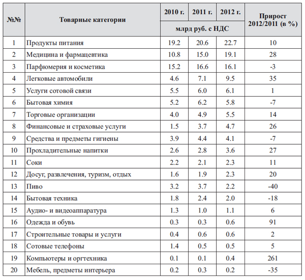 В число самых быстрорастущих категорий по итогам 2012 года вошли «Легковые автомобили», «Торговые организации» и «Финансовые и страховые услуги». Как показывает опыт, в кризисной ситуации данные товарные категории обычно демонстрируют спад. Рост этих категорий-«маркеров» рынка может рассматриваться как свидетельство стабильности в экономике.