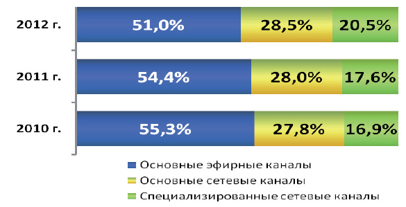 Рисунок 6. Доля рекламы в телеэфире отдельных каналов в 2012 году, %