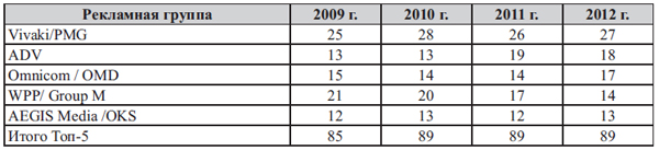 Высокая доля бюджетов, приходящихся на лидеров сегмента, характерна не только для рекламодателей, но и для медиабаинговых агентств. На сегодняшний день в России представлены практически все крупнейшие международные сетевые рекламные агентства. Доля телевизионных рекламных бюджетов, приходящаяся на первые пять крупнейших медиабаинговых групп (см. табл. 3), до недавнего времени росла. Если в 2008 году на вышеназванные группы приходилось 81 %, то в 2009 - уже 85 %. Таким образом, происходило укрупнение субъектов рынка. Это привело к тому, что на рынке телерекламы не осталось крупных российских агентств, которые или не выдержали конкурентной борьбы и потеряли клиентов, или были поглощены. Этот процесс закончился в 2010 году, когда доля крупных сетевых групп дошла до отметки 89 % и остается неизменной третий год подряд.