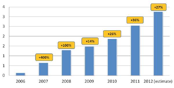 Рисунок 4. Динамика рекламных бюджетов неэфирного телевидения в 2006-2012