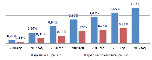 телевидения и в доходах рекламного рынка в целом, 2006-2012 гг., %