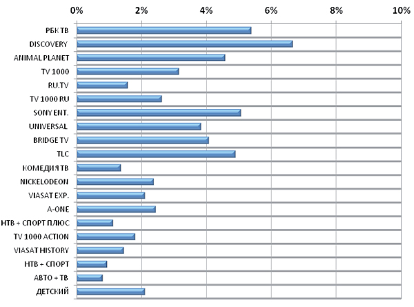 Данный сегмент обладает высоким потенциалом увеличения доли рекламы в общем времени вещания. На сегодняшний день доля рекламы в сетке каналов-лидеров по величине рекламных доходов составляет не более 5-7 %. В среднем по сегменту этот показатель не превышает 1-2 % (рис. 6). Понятно, что в данном телевизионном сегменте едва ли когда-нибудь будет столько же рекламы, сколько на общедоступных коммерческих телеканалах. Однако здесь есть еще возможности для существенного роста «инвентаря» для рекламодателей. Пожалуй, главная проблема - в инерции рекламных агентств, в нежелании прикладывать большие усилия для планирования и проведения рекламных кампаний на каналах с небольшой и «нишевой» аудиторией.