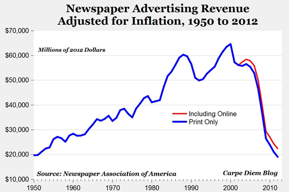 Но затем, внезапно, буквально за несколько лет газеты перестали получать доходы от рекламы.