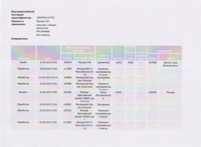 Так получилось, что, когда я планировал обратиться к Вам, Дмитрий Евгеньевич, с этим письмом, Национальной тиражной службе пришлось на собственном опыте убедиться в качестве работы ФГУП «Почта России». Дело в том, что мы ежегодно проводим конкурс «Тираж-рекорд года», победителям которого вручаем бронзовую статуэтку: «Нику». Они, победители, этим очень гордятся и публикуют фото этой статуэтки на первой полосе своих изданий. В этот раз на церемонию вручения наград не смогли приехать лауреаты конкурса из Якутии, газеты «Якутск вечерний». Причина очевидна – далековато. Попросили прислать статуэтку почтой, что мы и сделали. Приключения этой статуэтки по структурным подразделениям «Почты России» отражено в документе, который называется «Почта России: отслеживание почтовых отправлений», занимает полтора листа и содержит 13 пунктов – мест, где с этой посылкой проводили некоторые операции, смысл которых мне так и не удалось понять. Прилагаю к письму копию этого документа, возможно, Вам с помощью Ваших сотрудников удастся что-нибудь понять. Я, со своей стороны, могу сообщить Вам, Дмитрий Евгеньевич, что происходило на самом деле. 17 апреля мы отправили посылку из Москвы в Якутск, заплатив за это 393 рубля 50 копеек. В течение почти пяти месяцев мы пребывали в наивной уверенности, что редакция «Якутска вечернего» уже отпраздновала получение заслуженной награды. И вдруг, в середине августа раздается звонок из Якутии: «где наша награда?!» Мы – на почту. 14 августа подали посылку в розыск. И через месяц нам прислали сообщение, что мы можем получить нашу посылку по адресу заявителя, то есть в Москве, а не в Якутске, куда она была послана. И при этом нам еще надо заплатить 1000 рублей за хранение! Самое неприятное то, что, когда мы все-таки выкупили нашу статуэтку, она оказалась сломана так, что нам пришлось заплатить еще 2 тыс. 300 рублей за ее восстановление.