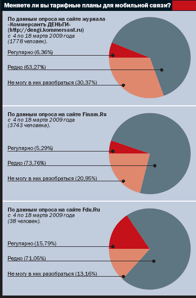 По данным агентство J'Son & Partners, которое специализируется на маркетинговых исследованиях в сфере телекоммуникаций и IT, в многочисленных тарифных планах не разбирается не только большинство абонентов, но и многие профессионалы. "Маркетинговая логика мобильных операторов и не предполагает, что их клиенты должны ориентироваться в тарифных планах,— уверен Сергей Потресов.— В девяти случаях из десяти продается не тарифный план, а привлекательные цифры с билборда. В лучшем случае потребитель ознакомится с тем, сколько стоит минута при звонках на номера других операторов". Отчасти это связано с тем, что операторы сознательно запутывают абонентов. Большинство посетителей гипермаркетов "Ашан", которые покупают тарифный план "А-Мобайл" (совместный проект ритейлера и МТС), радуются, что "первые 15 минут исходящих вызовов в день абонентам "А-Мобайл" — бесплатно", не вникая, сколько стоят звонки вне тарифа. А это 3 руб. за минуту — недешево.