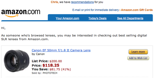 Если какой-то сегмент вашего списка контактов ранее воспользовался вашей услугой или приобрел у вас товар, используйте эти данные, чтобы персонифицировать письма, отправляемые этим людям. Нормальное программное обеспечение для автоматизации маркетинга может облегчить эту задачу. Amazon, к примеру, проделывает колоссальную работу, составляя список предложений на основе предпочтений его клиентов. Внизу представлен скриншот письма от Amazon покупателю, который ранее уже приобретал на сайте фотографическое оборудование, и которого может заинтересовать самый популярный в настоящее время объектив.