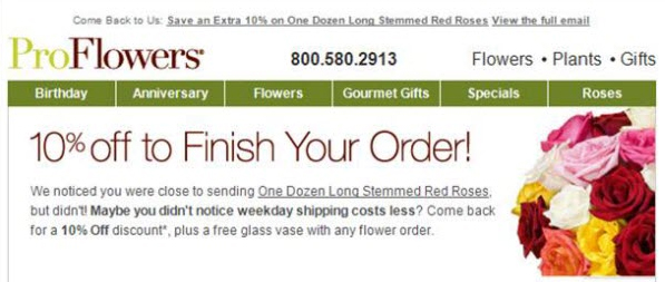 Если человек добавляет товар в корзину - он хочет его купить, вне зависимости от того, делает он, собственно, приобретение, или нет. Согласно SeeWhy, 48% онлайн-покупателей, опустошавших свои корзины чаще одного раза за последний месяц, так или иначе что-нибудь купят. Также, почувствовав прилив щедрости, вы можете дать своим покупателям дополнительный стимул приобрести что-либо в вашем магазине - как, например, это сделано в email от цветочного магазина ProFlowers. («Мы заметили, что вы уже практически купили дюжину длинных красных роз, но не сделали этого. Возможно, вы не заметили, что по будням доставка стоит дешевле. Возвращайтесь за 10% скидкой, а также получите в подарок стеклянную вазу при любом заказе».)